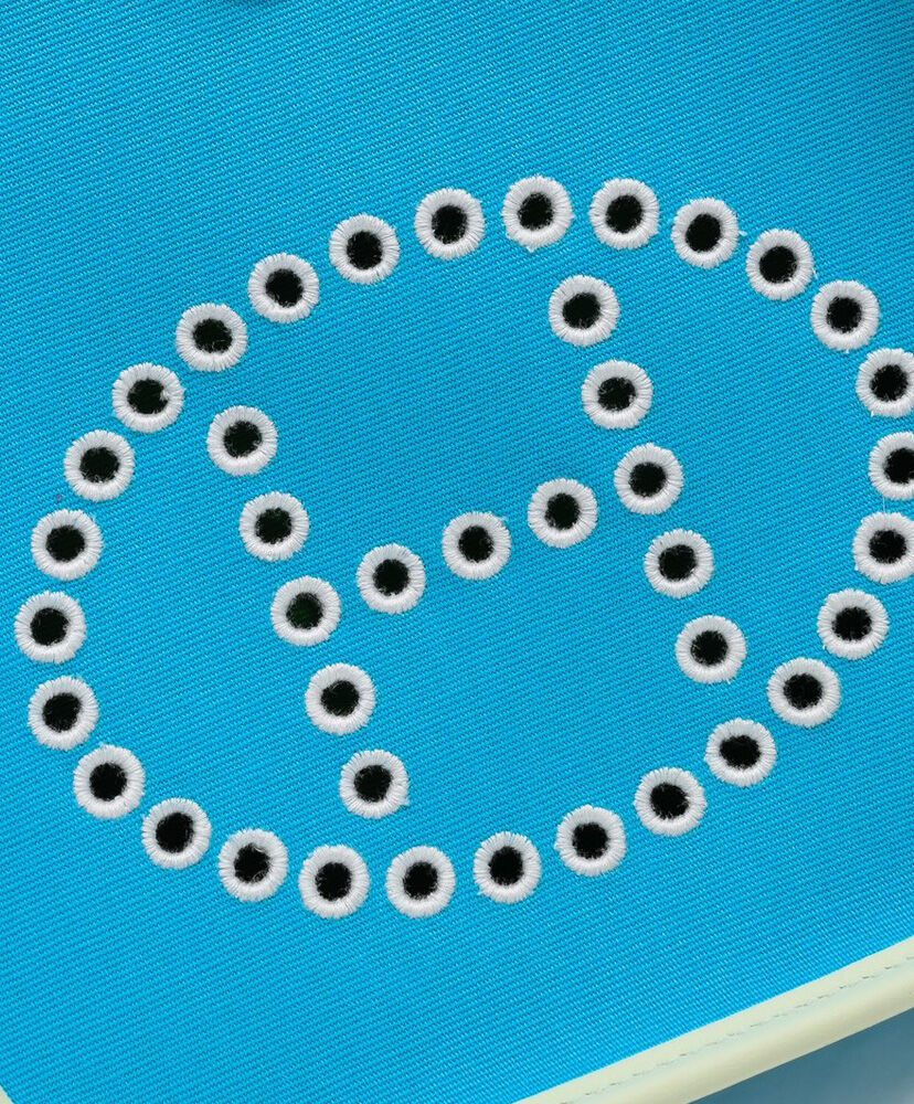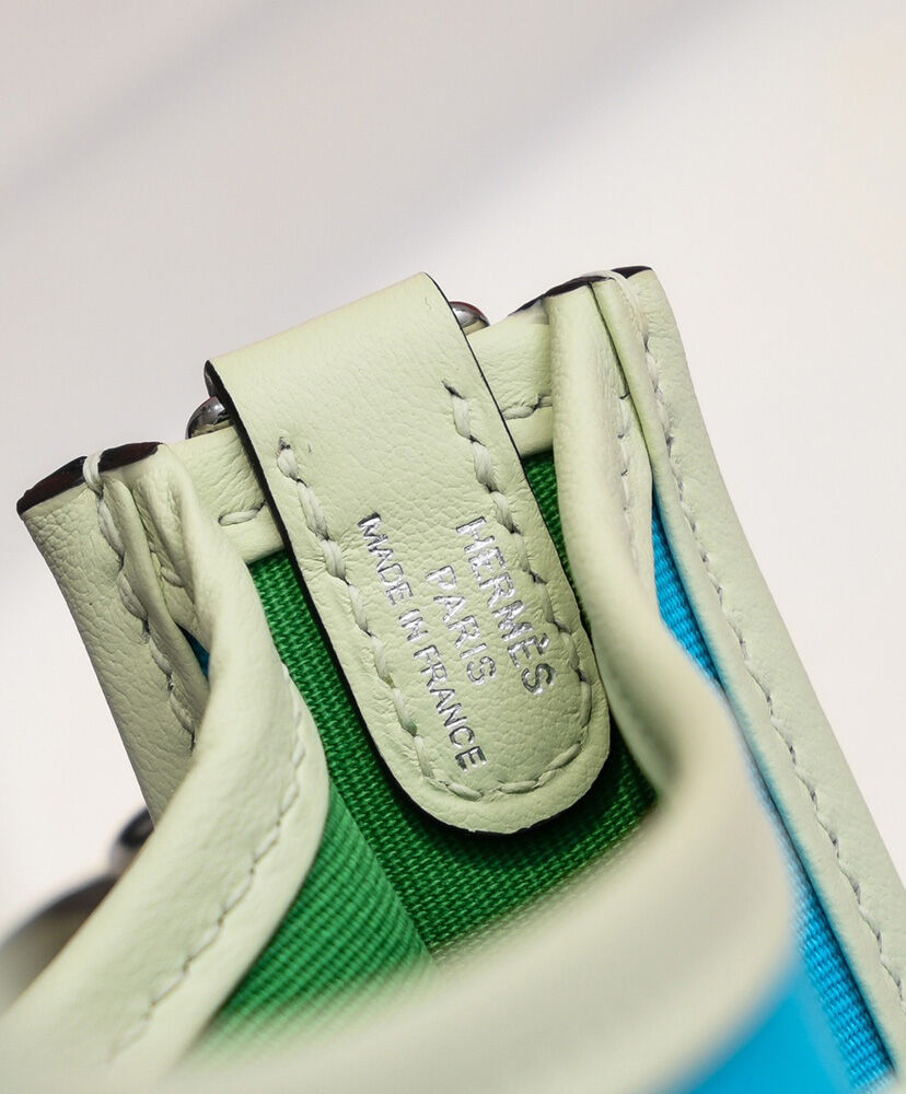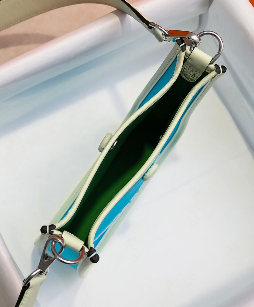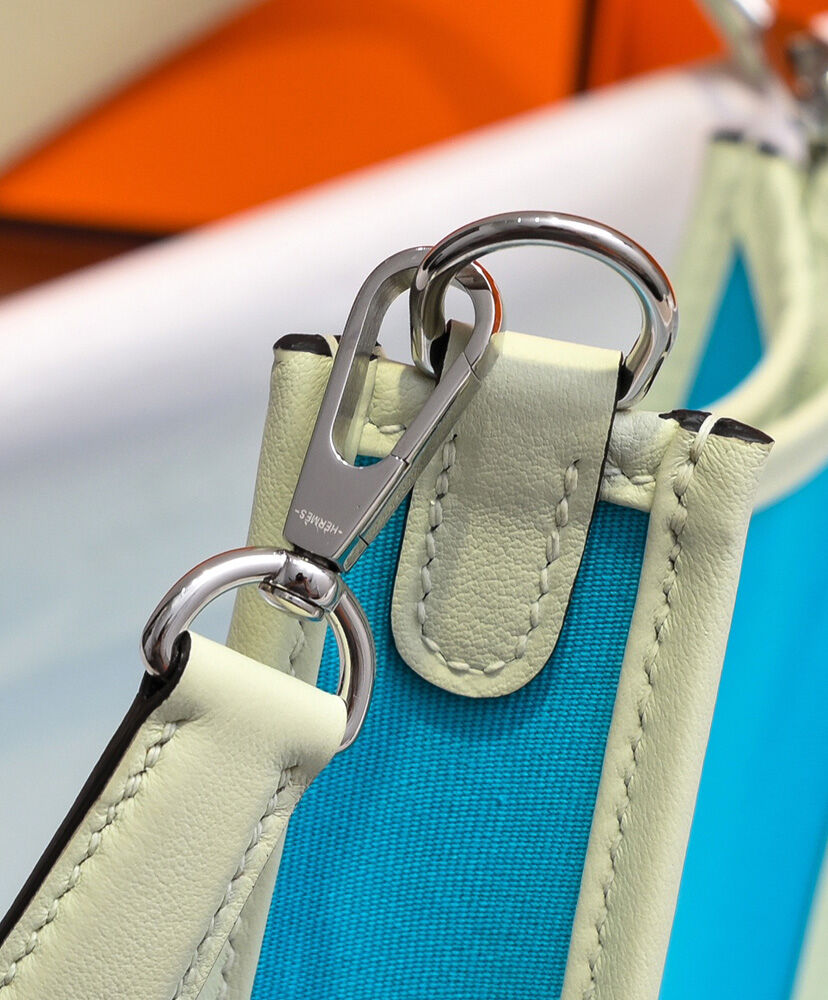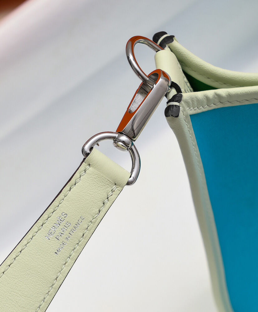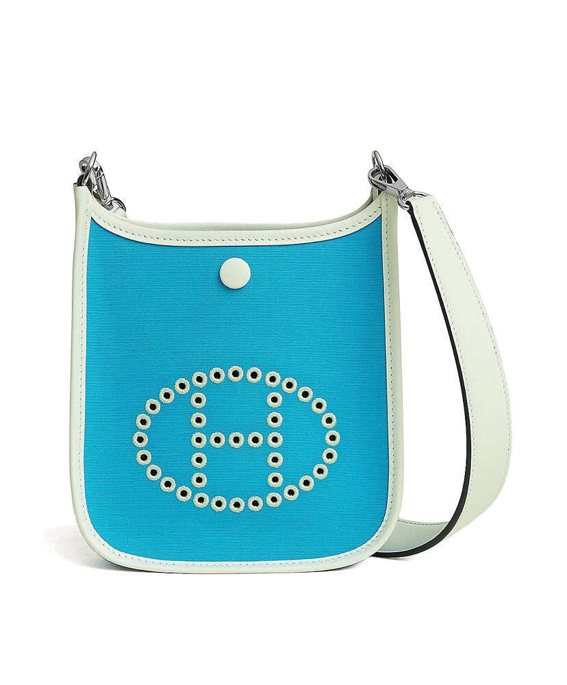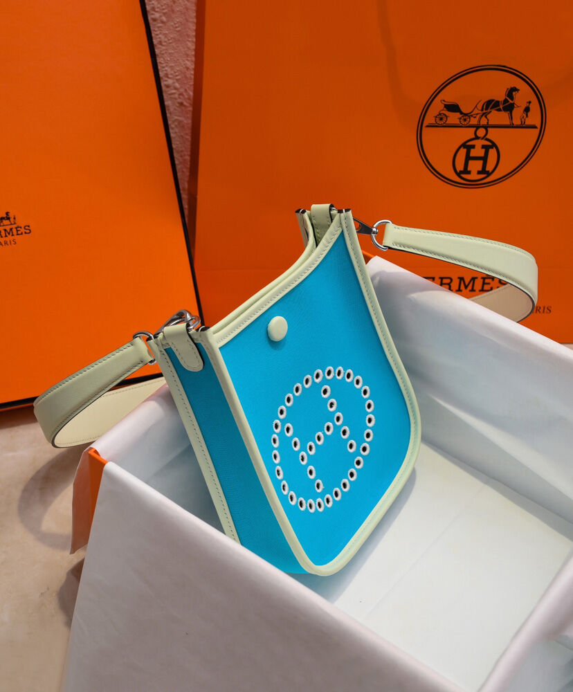 The emblematic Evelyne bag reinvents itself in a fantasy version for the summer with different colors and textures surrounding the signature "H" perforations in English embroidery. The leather strap allows for a short carry for a modern look.
