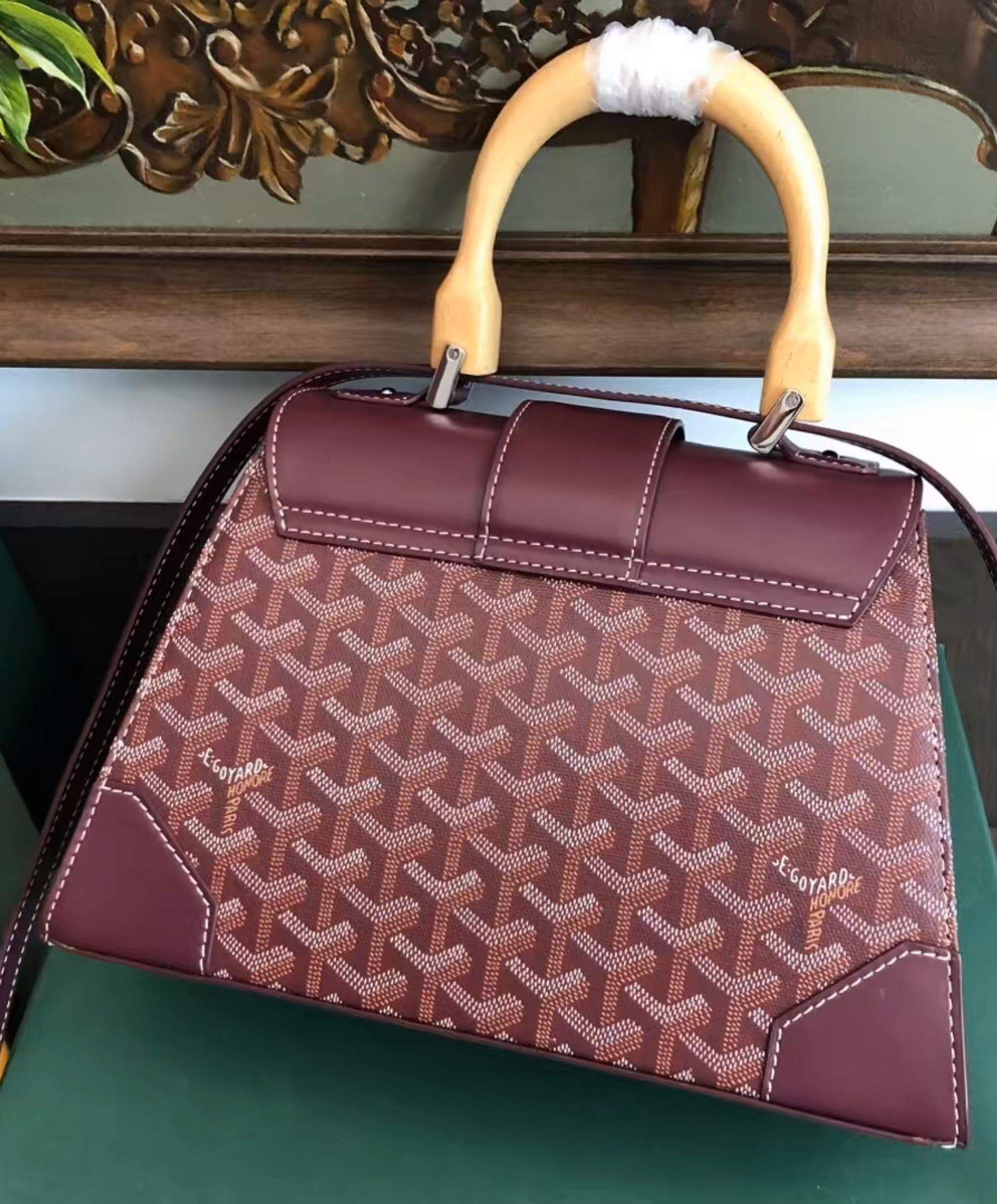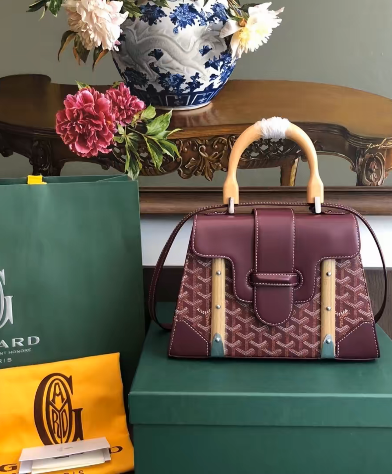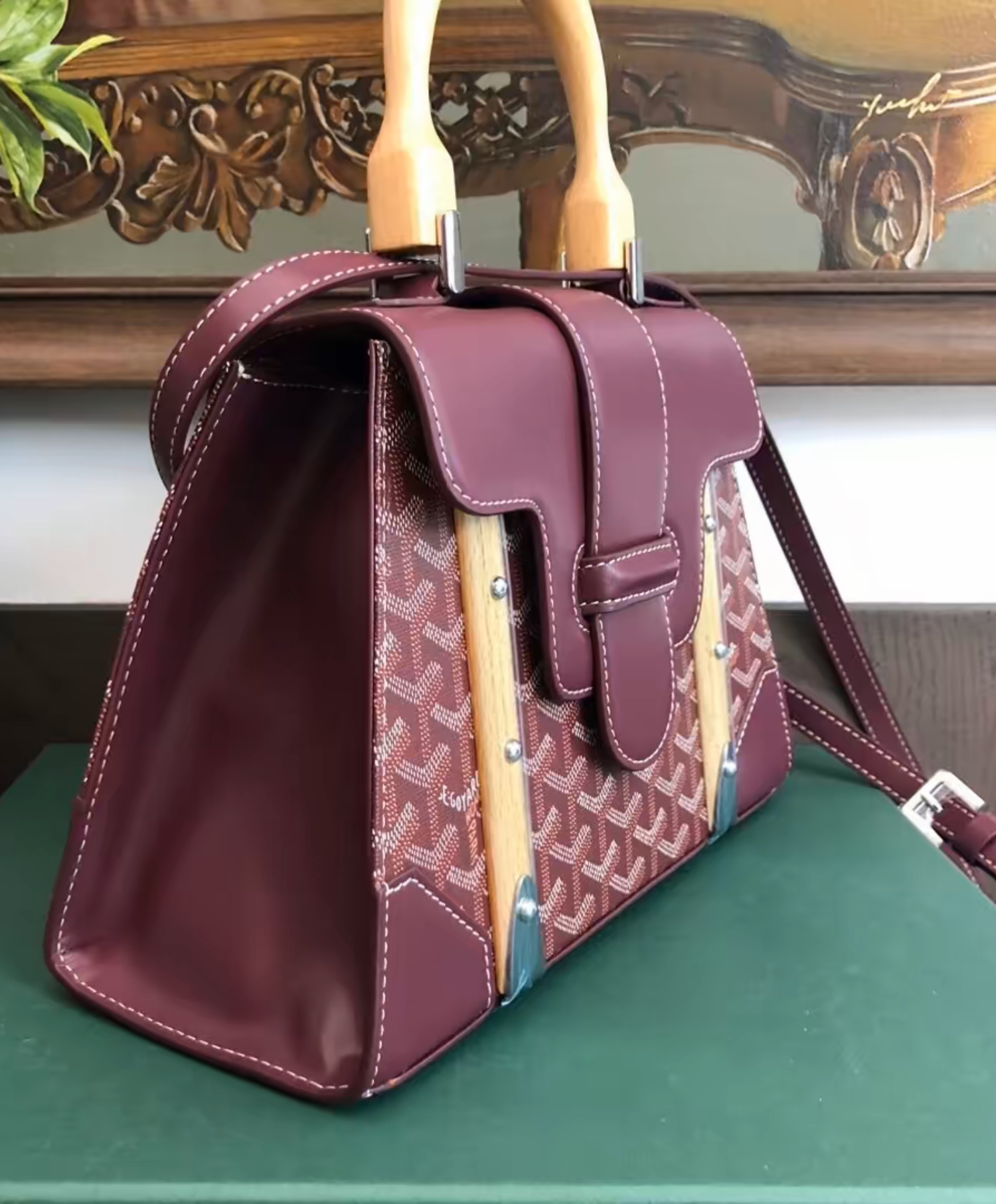 The Saigon bag is one of Maison Goyard’s emblematic pieces as it inherits all our trunk-making signature codes like the wood batons, leather corners and trunk rivets. In this structured PM format, the Saigon bag can be worn with or without a strap for an elegant evening style.
