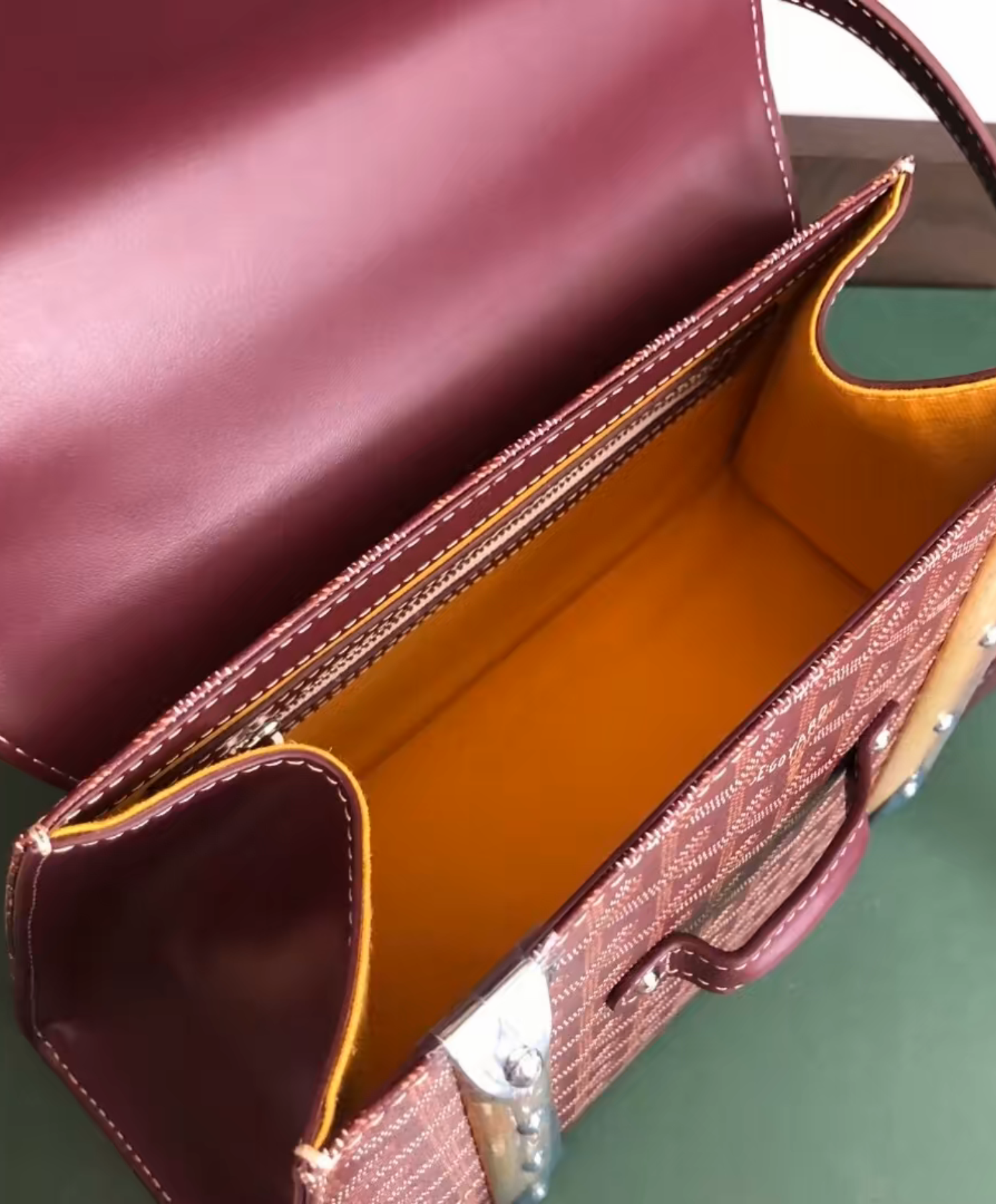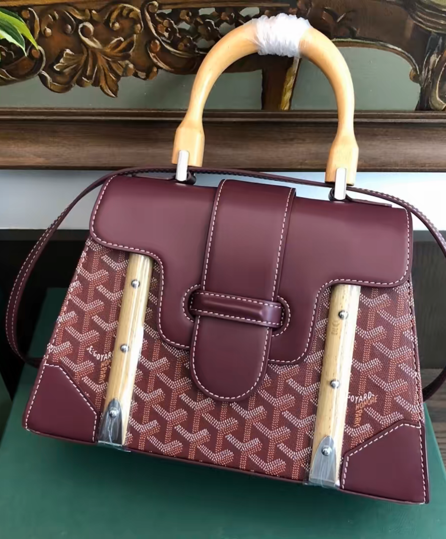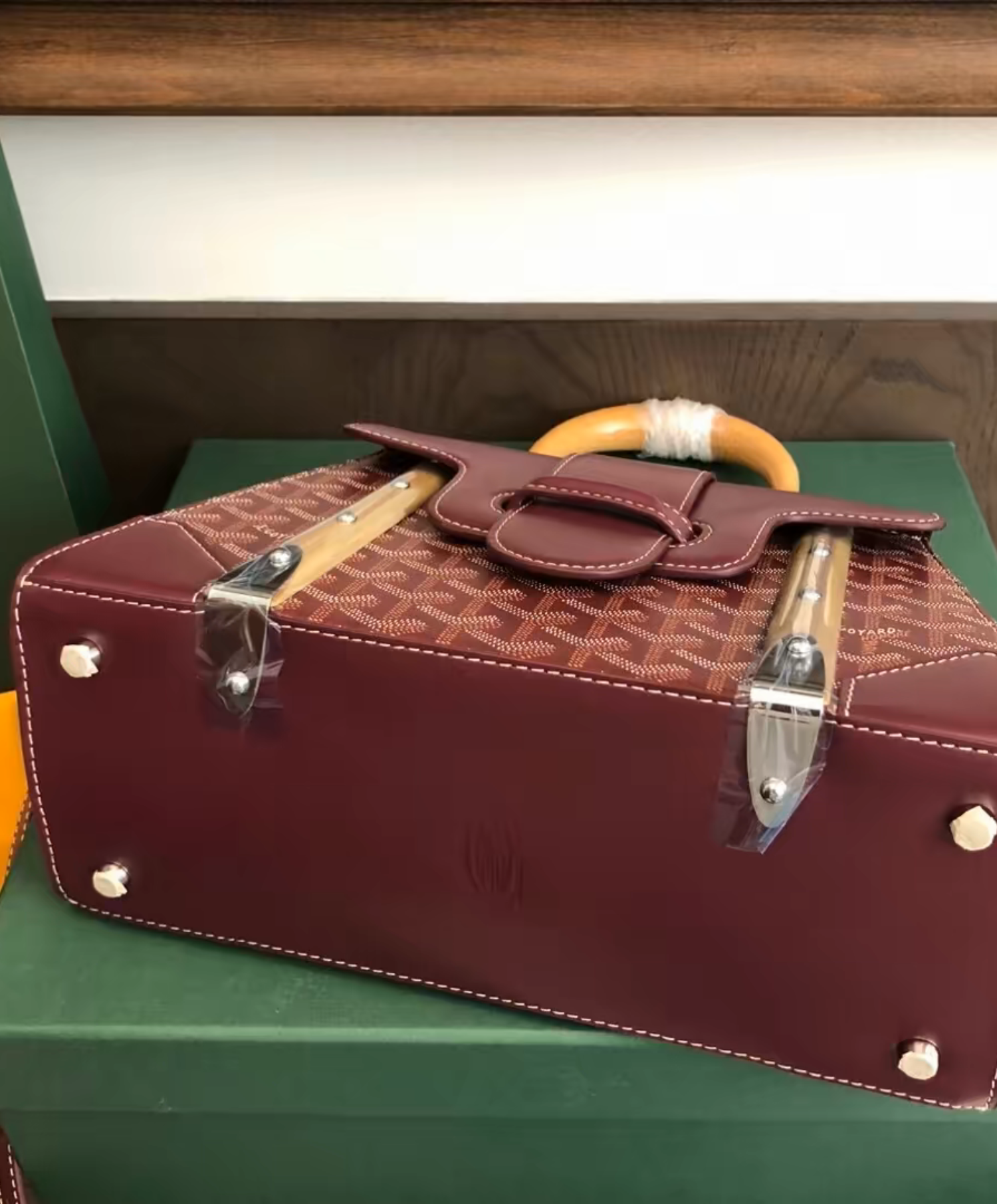 The Saigon bag is one of Maison Goyard’s emblematic pieces as it inherits all our trunk-making signature codes like the wood batons, leather corners and trunk rivets. In this structured PM format, the Saigon bag can be worn with or without a strap for an elegant evening style.