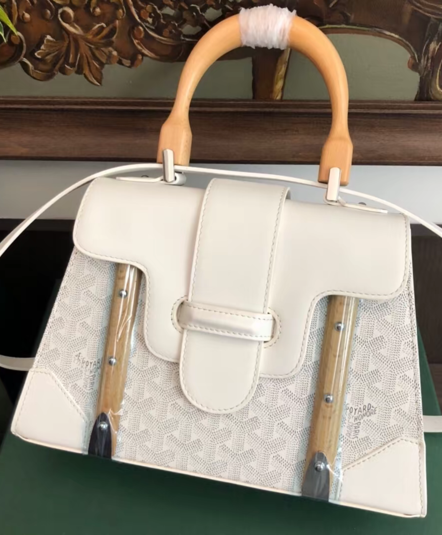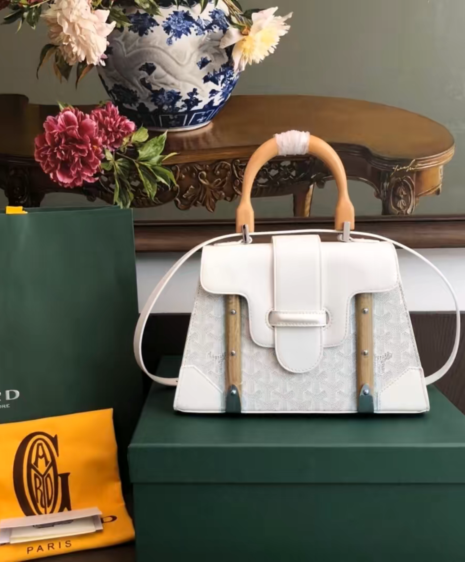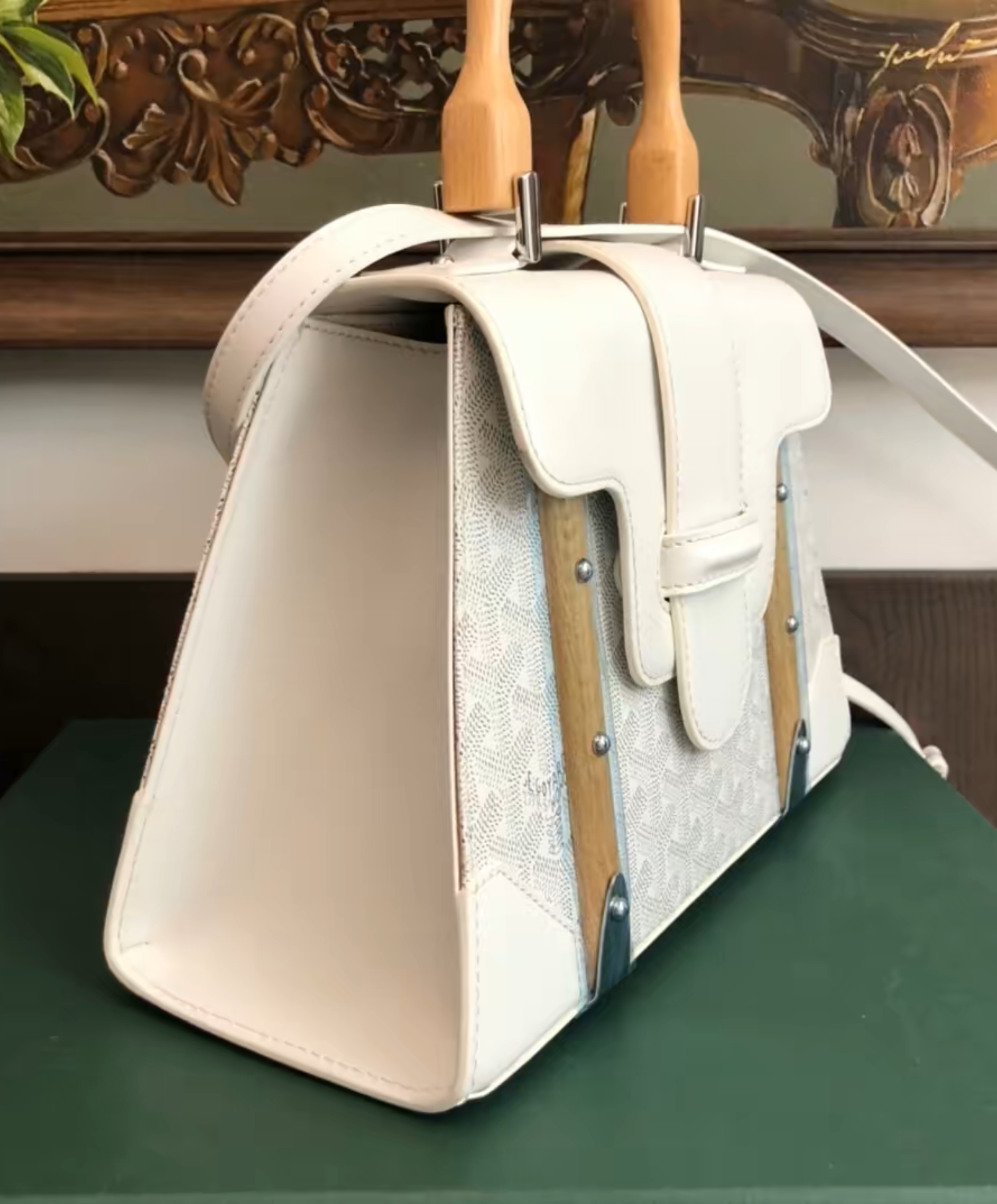 The Saigon bag is one of Maison Goyard’s emblematic pieces as it inherits all our trunk-making signature codes like the wood batons, leather corners and trunk rivets. In this structured PM format, the Saigon bag can be worn with or without a strap for an elegant evening style.