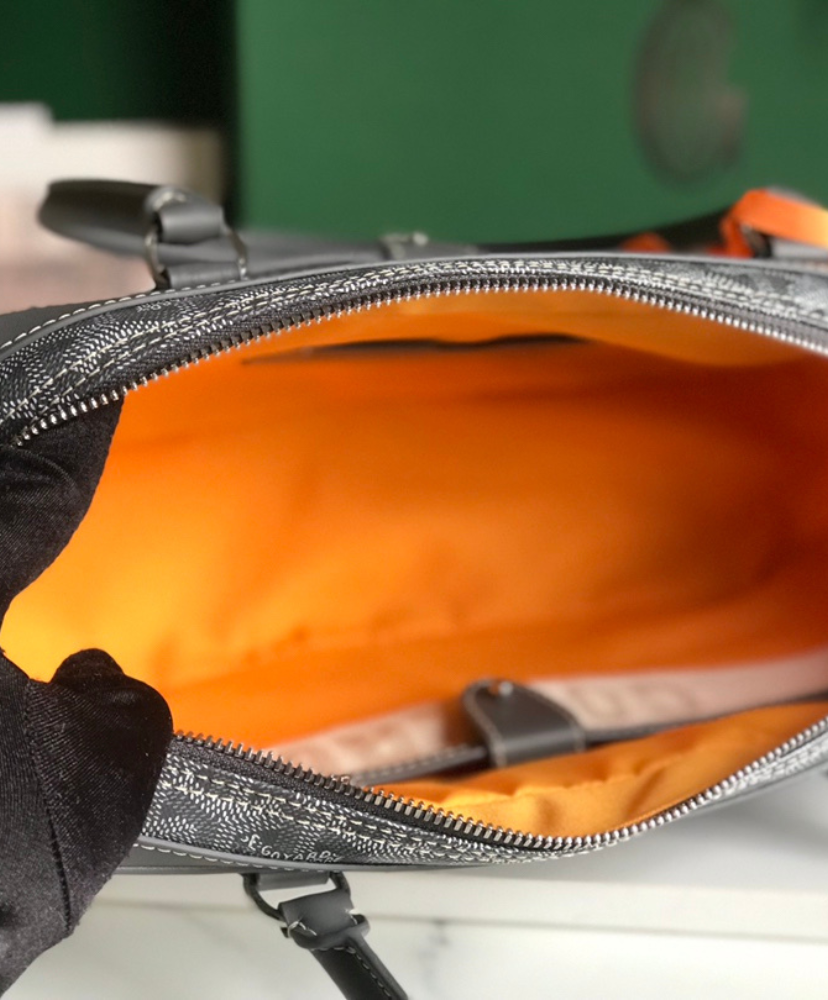 This Saint Martin bag is crafted from gray monogram Goyardin canvas with silver hardware. Features bottom pegs, a top zipper closure, and an exterior front pocket.