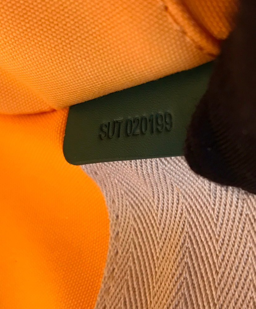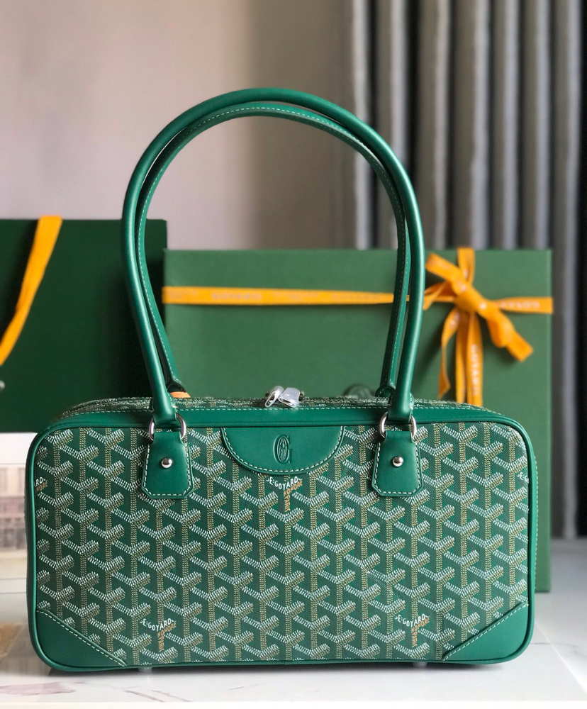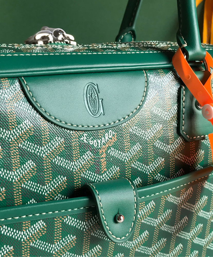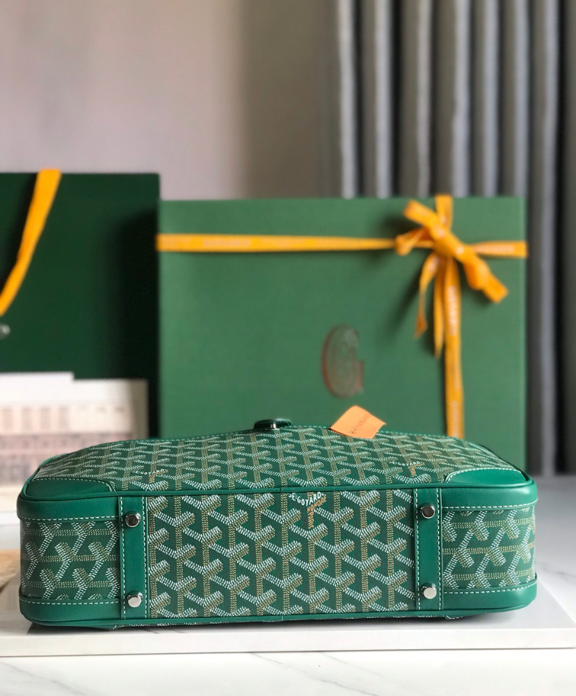 This Saint Martin bag is crafted from green monogram Goyardin canvas with silver hardware. Features bottom pegs, a top zipper closure, and an exterior front pocket.