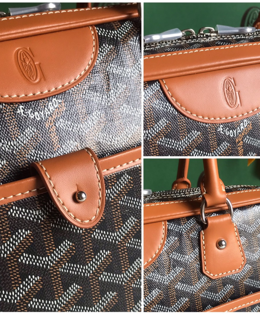 This Saint Martin bag is crafted from black and tan monogram Goyardin canvas with silver hardware. Features bottom pegs, a top zipper closure, and an exterior front pocket.