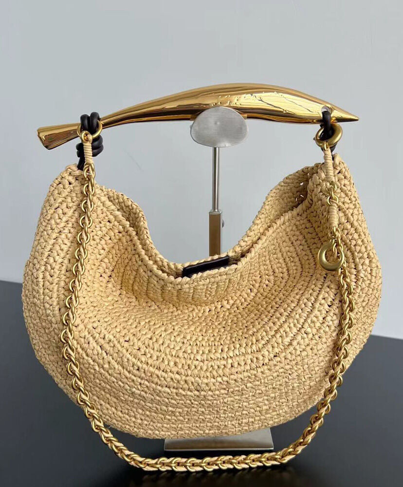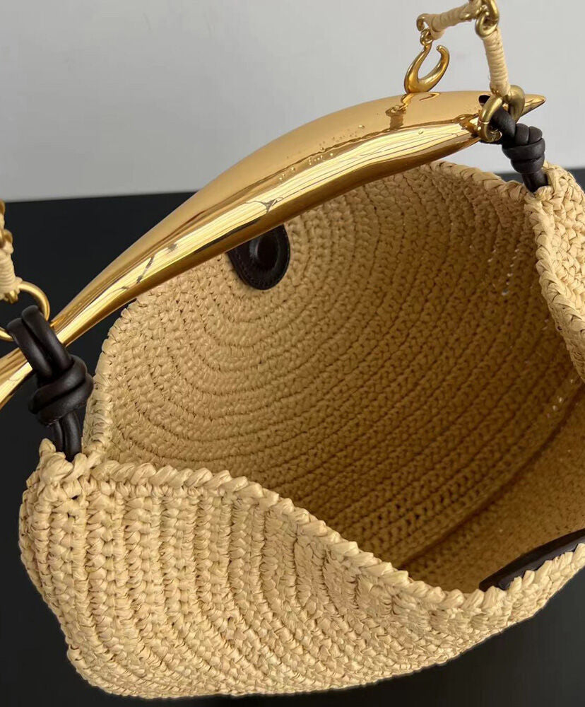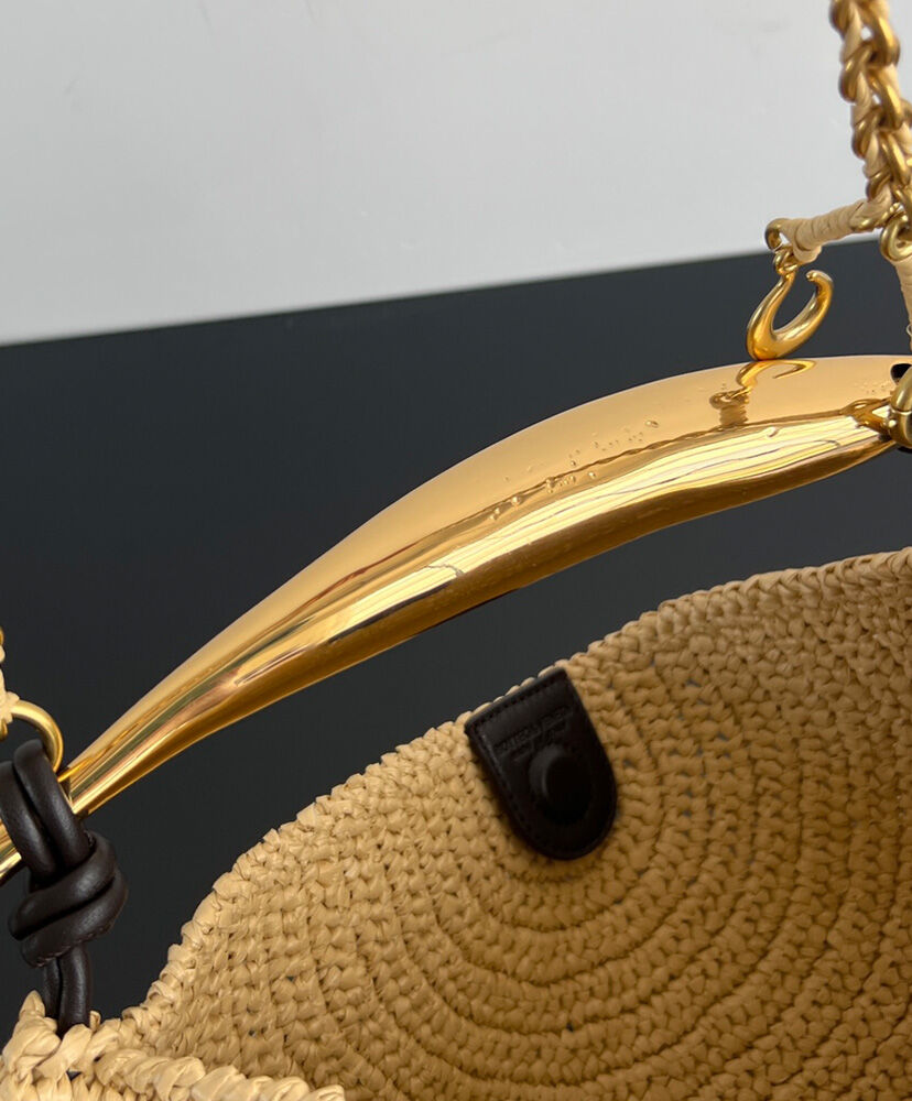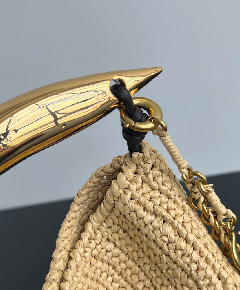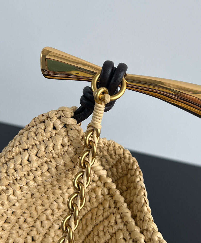 Raffia crochet bag with sculptural metallic top handle and tubular leather braided metal chain.