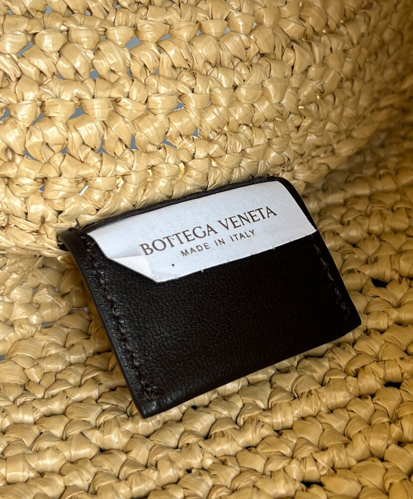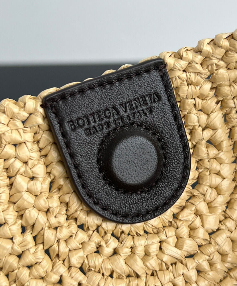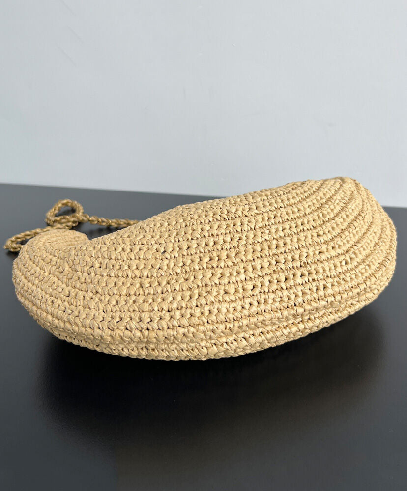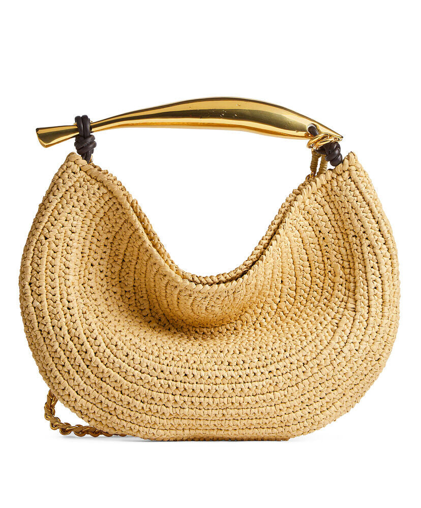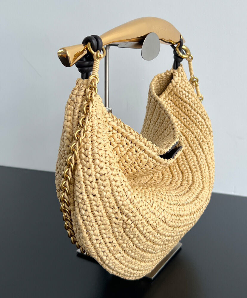 Raffia crochet bag with sculptural metallic top handle and tubular leather braided metal chain.