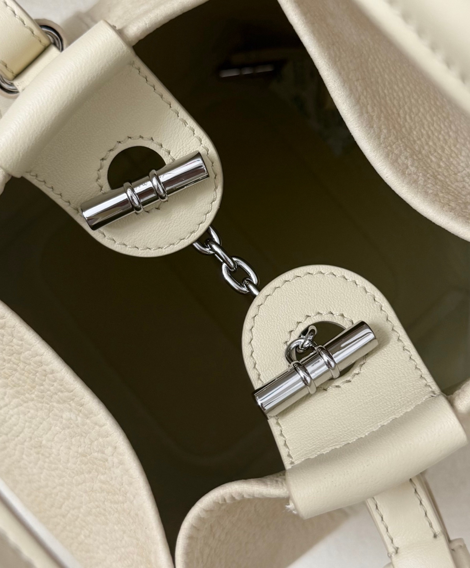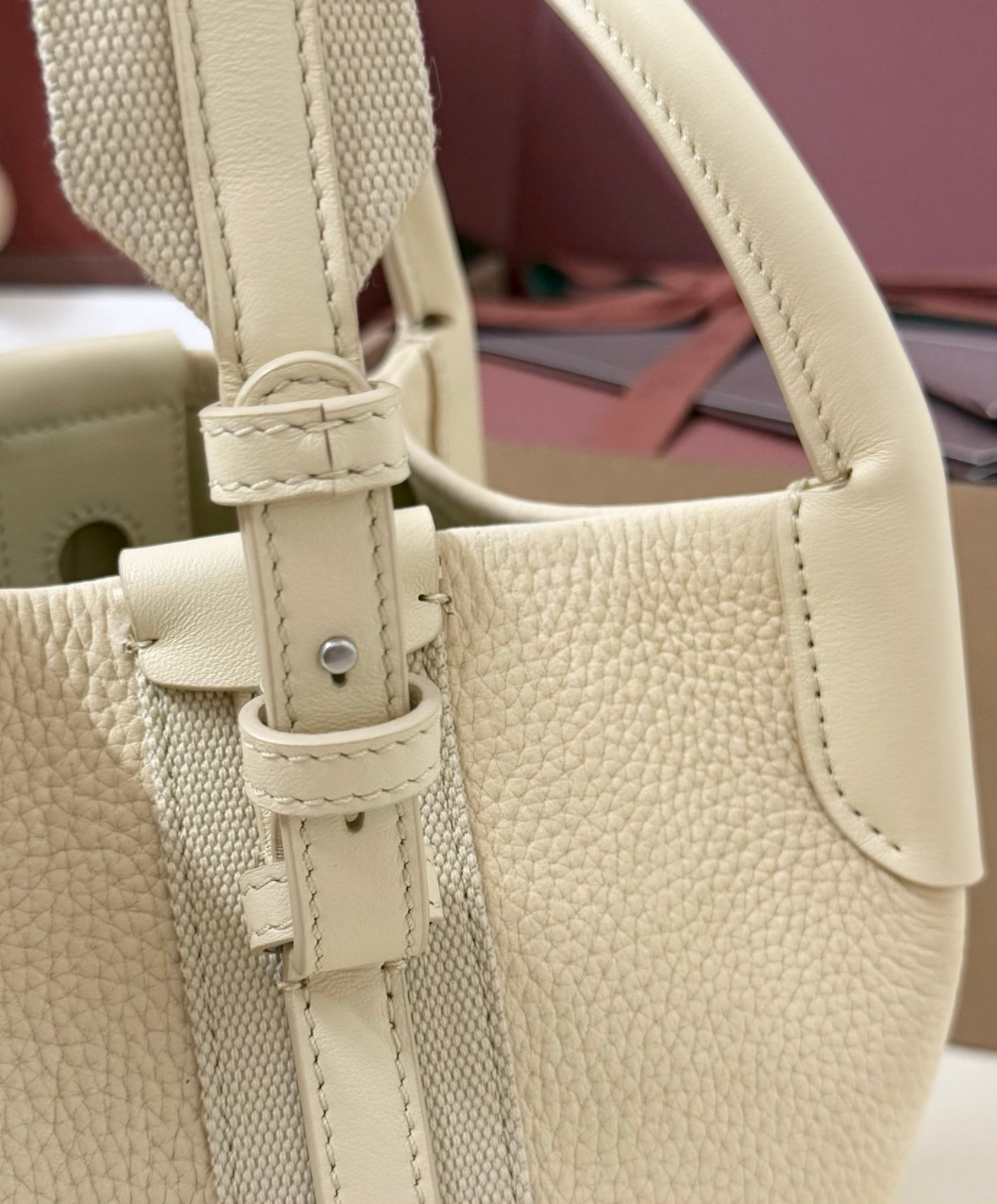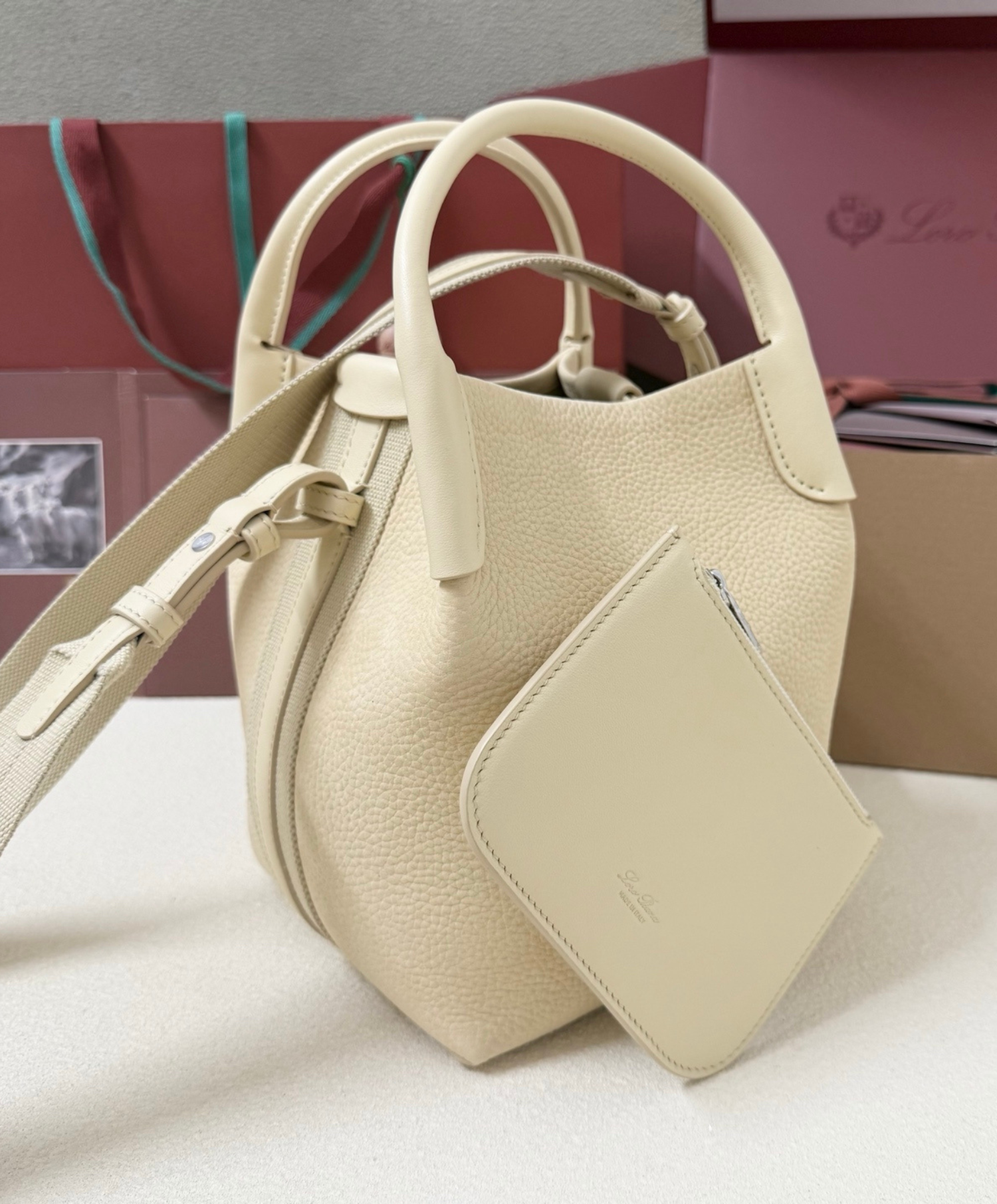 The Bale, a sophisticated bucket bag in small size with handstiched handles, inspired by Loro Piana’s textile heritage. Its silhouette, touch, and feel recall the cashmere bales, large bundles of the raw precious material. With a seamless design and unique lightness, the Bale bag is a celebration of supple softness and encapsulates the savoir-faire of the Maison. Effortless and casual, it is ideal for carrying all daily essentials with ease. The bag can be carried by hand or crossbody thanks to its removable strap.
