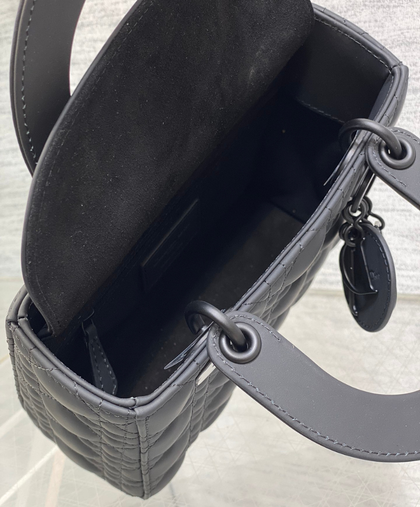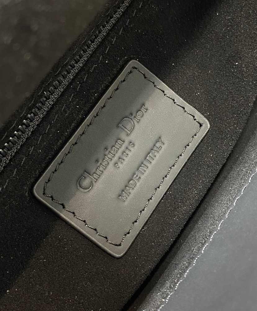 The Lady Dior My ABCDior bag epitomizes Dior's vision of elegance and beauty. Sleek and refined, the timeless style is crafted in black ultramatte calfskin with Cannage stitching, creating the instantly recognizable quilted texture. Tonal metal D.I.O.R. charms further embellish its silhouette with an elegant allure. Featuring a shoulder strap that can be personalized with badges, the small, unique design may be carried by hand or worn crossbody.