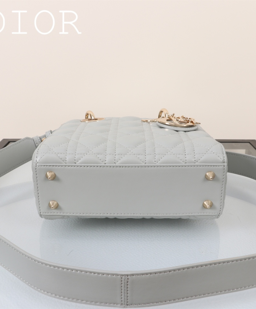 The Lady Dior My ABCDior bag epitomizes Dior's vision of elegance and beauty. Sleek and refined, the timeless style is crafted in cloud gray lambskin with Cannage stitching, creating the unmistakable quilted texture. Pale gold-finish metal D.I.O.R. charms lend elegant appeal. Featuring a strap that can be personalized with symbolic badges, the small, unique design may be carried by hand or worn crossbody.