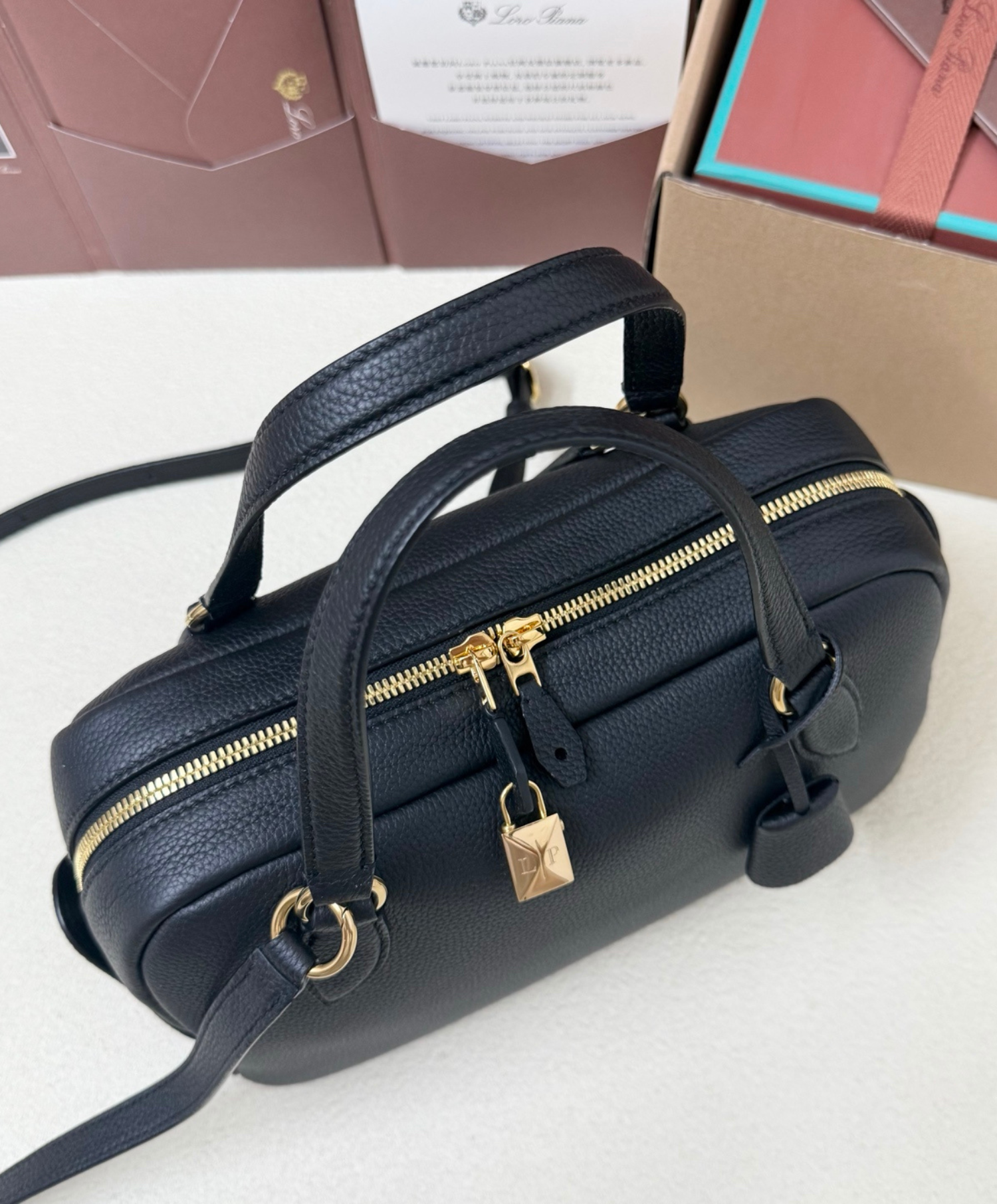 Here presented in a small size, the Needle is a Loro Piana interpretation of the bowling bag, complete with the iconic LP charms. Evoking the Maison’s textile heritage, it is inspired by the bags used to carry knitting needles. It is constructed with soft, sinuous lines, allowing for versatile wear over the shoulder or in hand. Crafted from fine-grained leather with a velvety suede lining, it has a harmonious silhouette and is made with a single piece of leather along the sides.